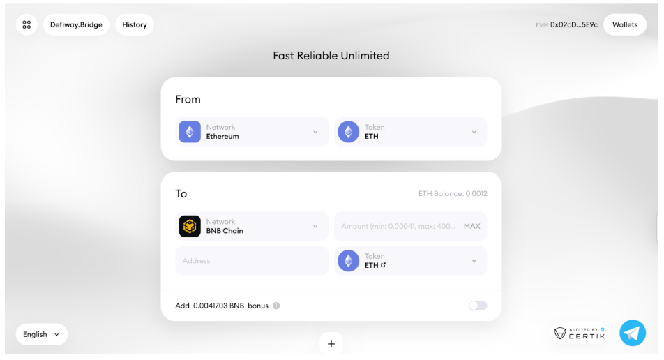 If you’ve found an arbitrage opportunity but the assets are in different networks, the trade often loses profitability since using a bridge to move between networks is typically slow and expensive. You may need several wallets because one wallet doesn’t always support all networks. Defiway allows you to transfer assets between major blockchains in seconds using just one wallet — with a minimal fixed fee of 0.2%.