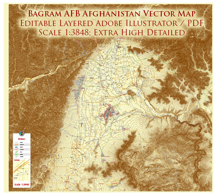 Printable PDF Vector Map of Bagram Air Force Base Afghanistan detailed City Plan scale 1:3848 full editable Adobe PDF Street Map  + Relief Topo in layers, scalable, curves format all names, 42 MB ZIP