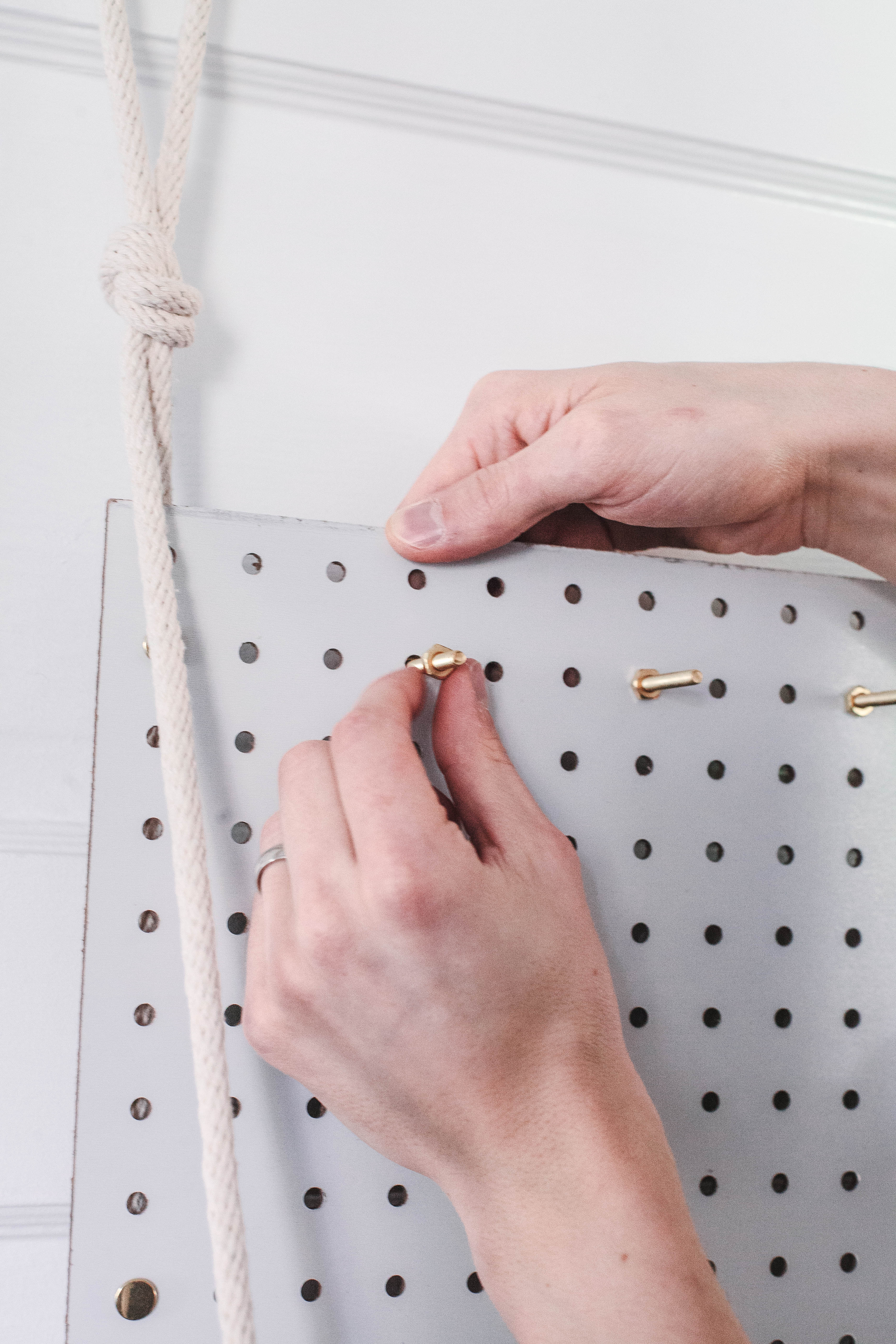 - Push your bolts through pegboard from behind and secure with a nut from the front.