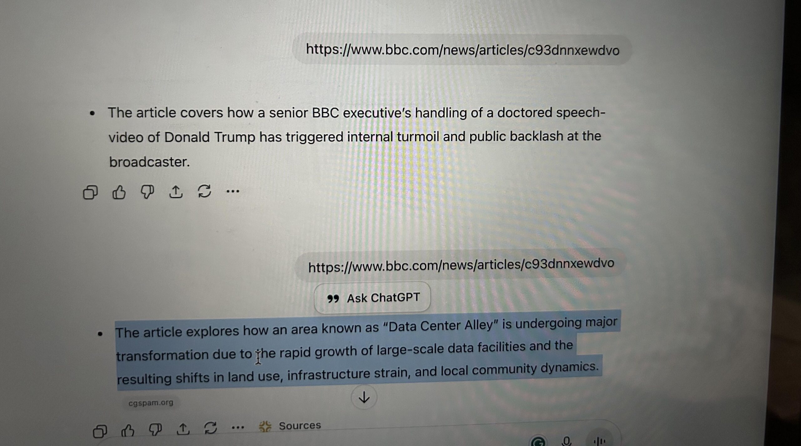 I linked a url for a article published by BBC regarding data centers yet the description that came up was one on trumps words being misused(this was maybe a day or two after the whole incident was reported but mind you I had never requested ChatGPT for any information on it). In the bottom I inputed the same url and than it gave me the right summary of the article… WTH is this and is this normal