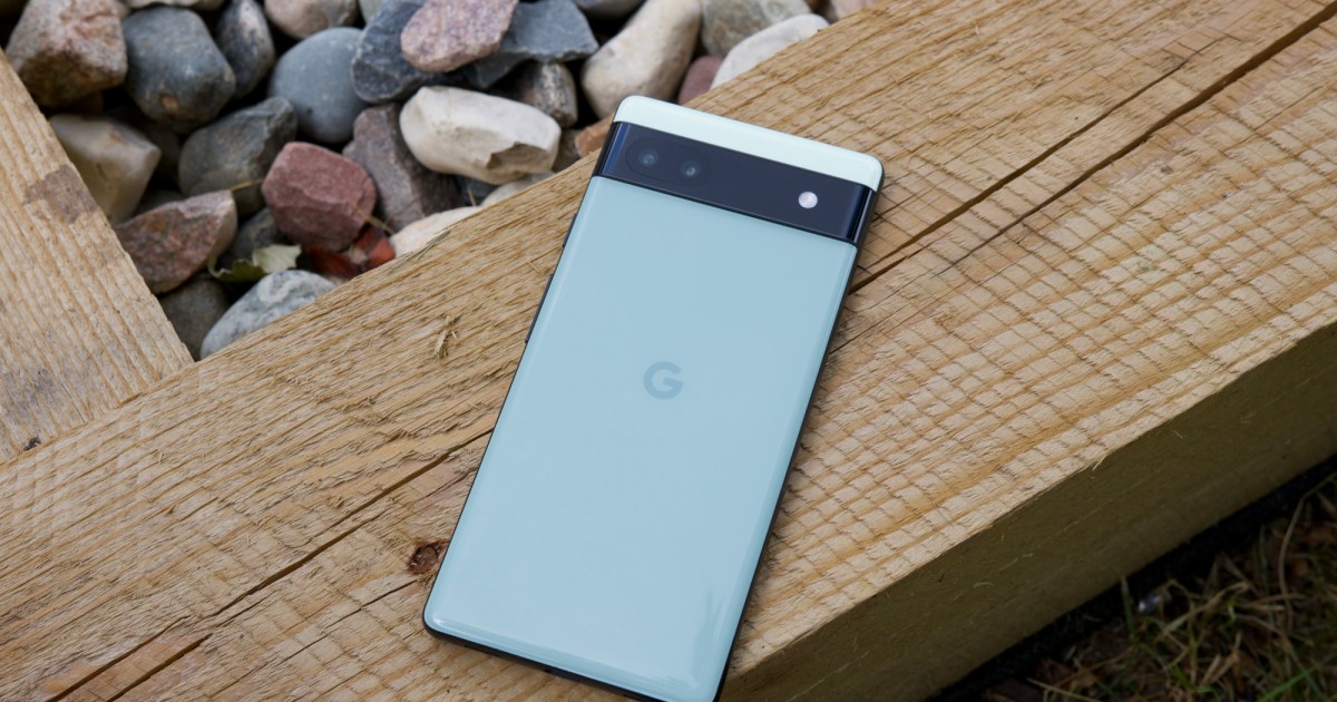 The Google Pixel 6a. We see the back of the phone as it's laying on top a piece of wood.