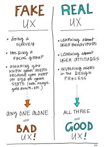 So back to this business of bad (fake!) and good (real!) UX. As this handy illustration notes, bad UX is pretty easy to do — just put up a survey asking your users what they think! Or get a bunch of users around a table, focus-group-style, and ask them their opinions! Or limit your insights into your users to simply monitoring statistics (whatever those stats may be)!