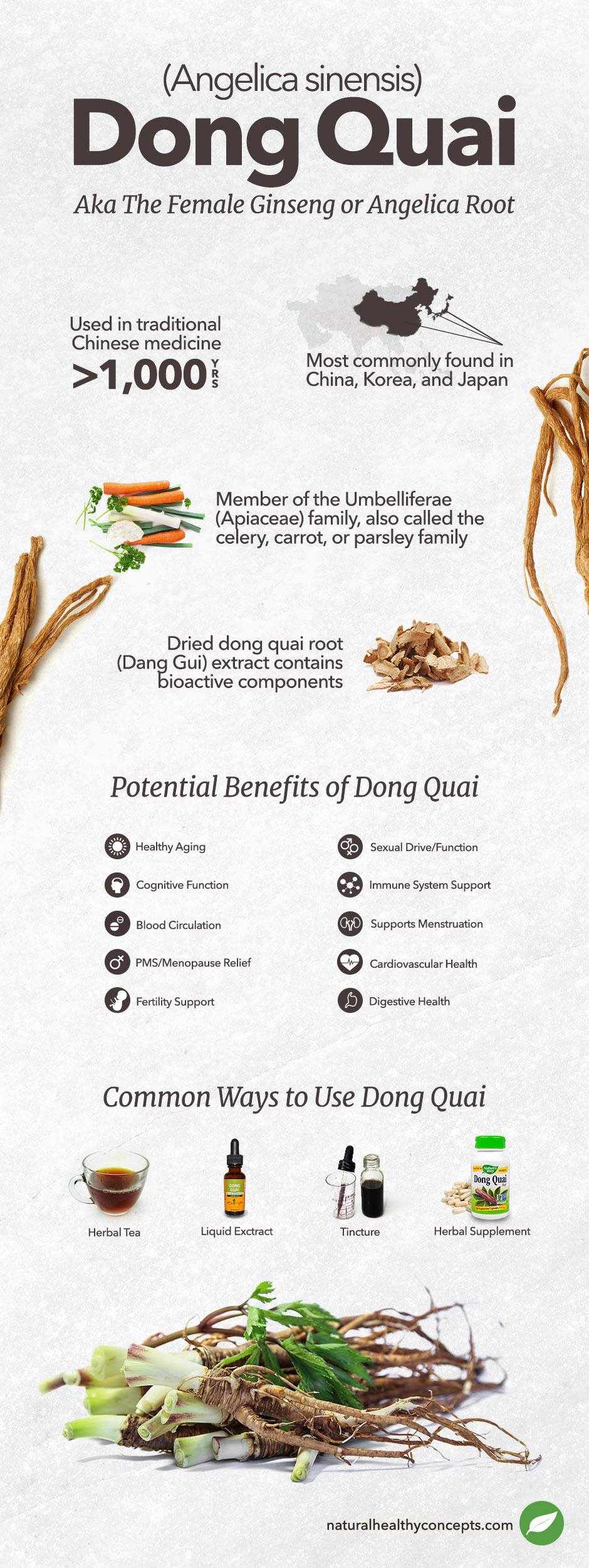 According to TCM, different parts of dong quai may have various effects on human health. However, more commonly, parts of the dried dong quai root, for instance, may be taken in dietary supplements and have some of the additionally outlined potential health benefits.