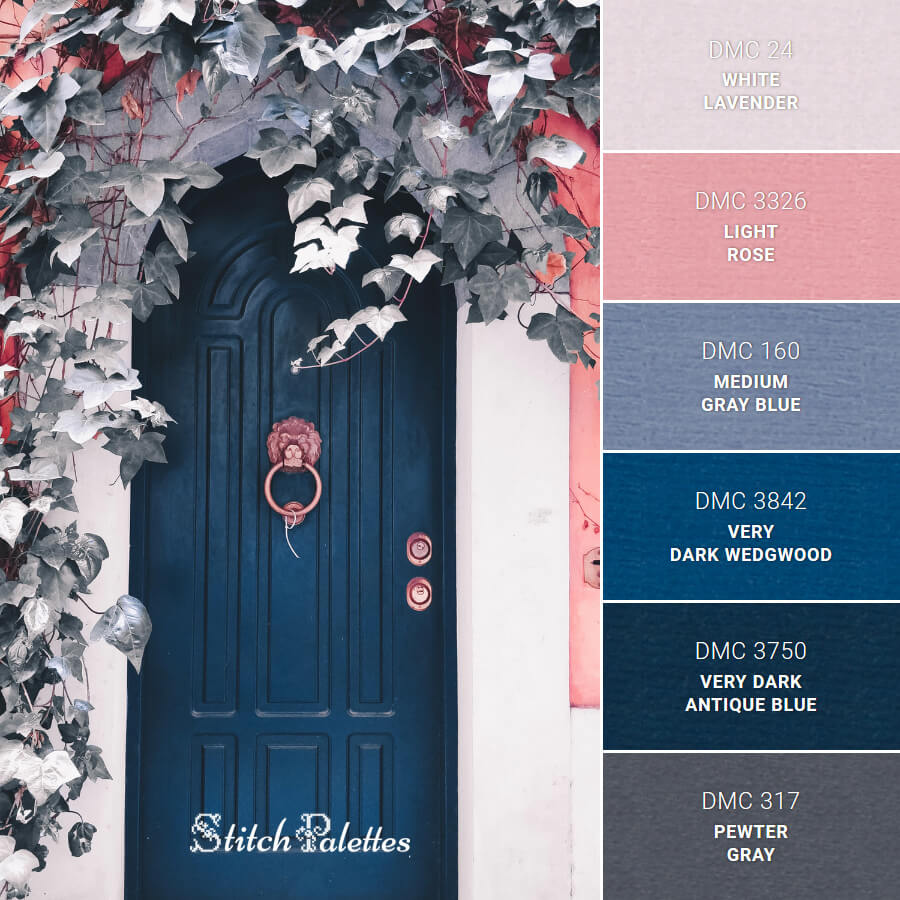 Color palette for your embroidery with the following thread colors: White Lavender, Light Rose, Medium Gray Blue, Very Dark Wedgwood, Very Dark Antique Blue, Pewter Gray