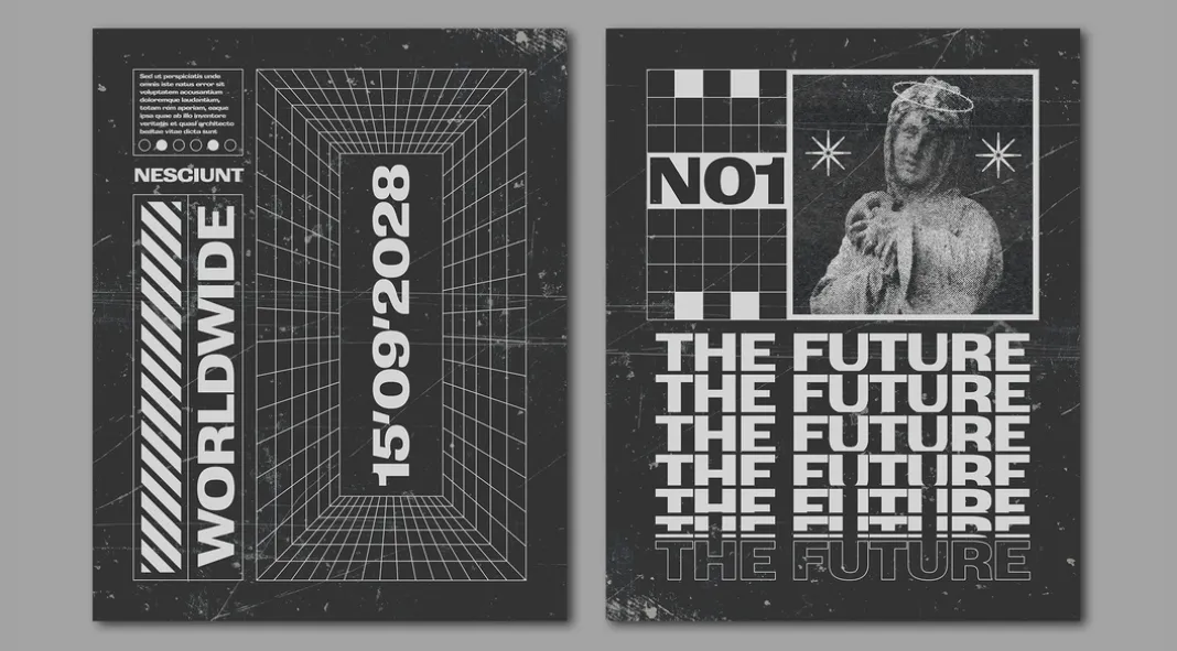 Emphasizing repetition and a grid layout, this design boldly states “The Future” in a stacked format. Accompanied by a classical statue image, this template merges historical art with modern typography, ideal for forward-thinking brands or futuristic content.