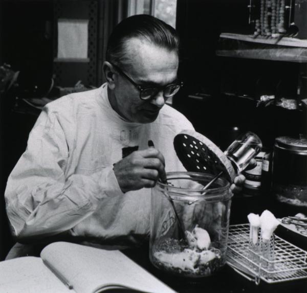 Only one building was restricted during the 1951 NIH open house—Building 7, specially designed for infectious disease research. Children under 16 were not admitted. And there was only one demonstration: Dr. Karl Habel of NIH’s NIAID showed the special procedures necessary in the collecting and handling of material for research on and vaccine development for rickettsial diseases carried by ticks. In this photo, is Dr. Habel following his own advice?