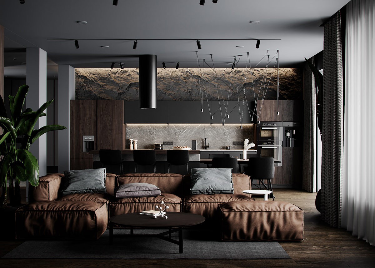 Walnut, rich brown and solid black come together as an earthy decor palette in this sophisticated home interior, designed by BODES Studio. Smoky grey drifts through as a connecting shade, whilst mature indoor plants grow green moments of uplifting contrast. Eye-catching deep rock feature walls add rugged character to a TV wall in the living room, the kitchen and in the bedroom too. The whole look is topped and tailed with beautiful lighting solutions that accentuate every perfected detail. From impressive modern pendants and recessed ceiling strips, to glowy feature edging and baseboard LED ribbons, this place is well equipped to show off all of its assets in the very best light.