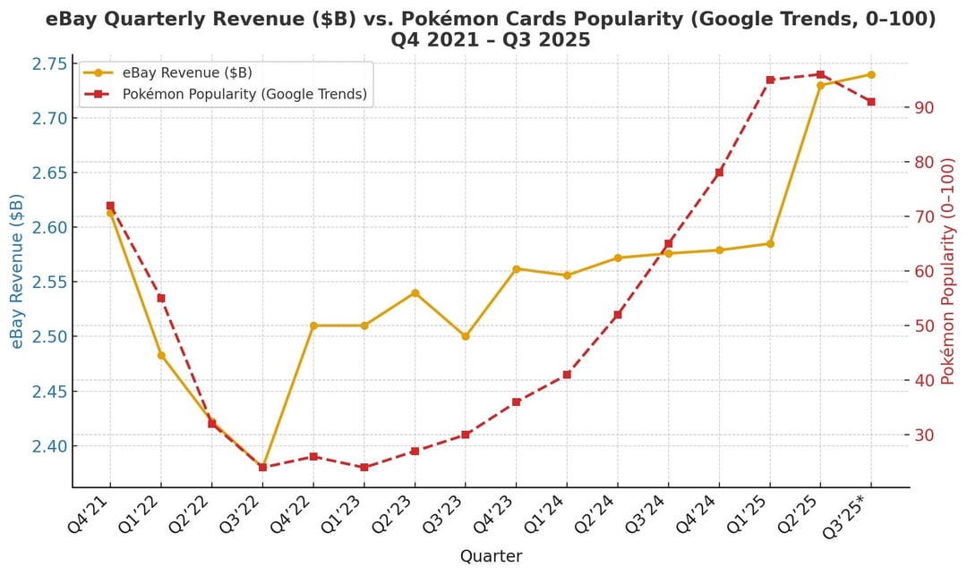 Need Confirmation? The recent poke-boom = confirmation: Last 8Q (rising Pokémon era): Lag1/2 hit 89-90% correlation, 79-81% R² — Pokémon alone “causes/correlates to” ~80% of eBay’s 2025 revenue explosion (from $2.57B → $2.74B).