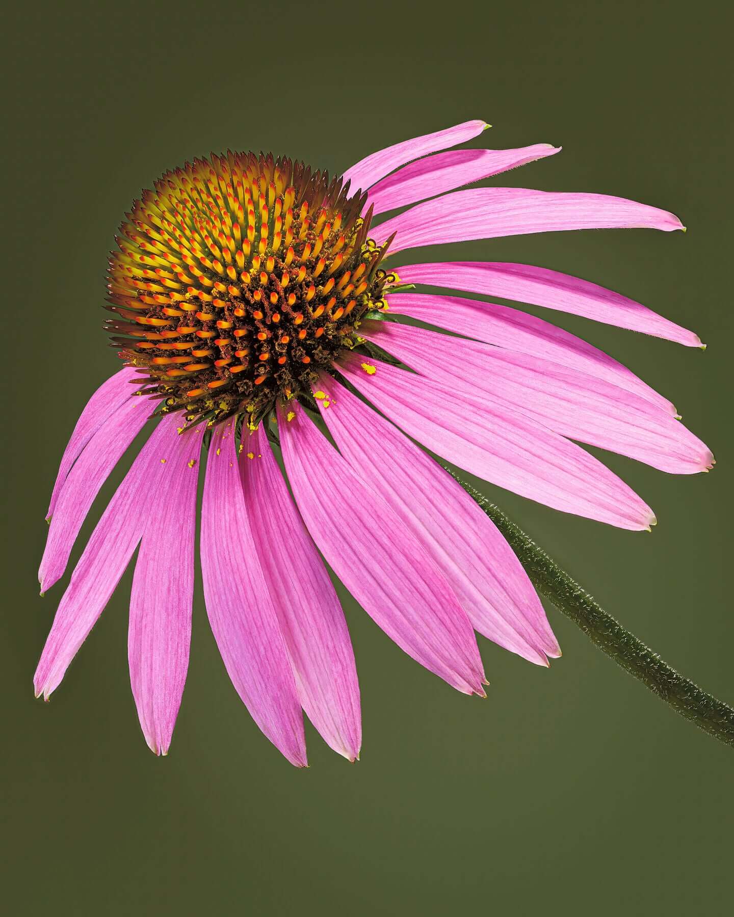 Echinacea purpurea (Coneflower) is a perennial plant with striking pink to purple daisy-like flowers that create a cone shape around the seed head. The name derives from the Ancient Greek word “echinos” for hedgehog, or sea urchin, which refers to the striking spiny bracts, or paleae, in its centre.