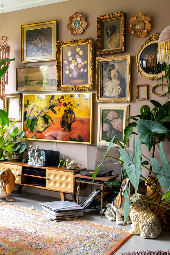 Zoals gezegd, heb ik er best wat maanden over gedaan om alle vondsten te verzamelen voor de nieuwe wand. Ik nam het grootste deel mee uit kringloopwinkels, maar kocht ook een paar items bij Fortune Flea in Amsterdam. Het gypsy schilderij vond ik via Marktplaats en de losse gouden lijsten had ik al een hele tijd geleden voor een prikkie op Vinted op de kop getikt. Ik koop dus in principe van alles dat me aanspreekt en let er niet perse op of het ook bij elkaar past. Ik ben vooral dol op overdadige gouden lijsten, dus dat zit er veel tussen.