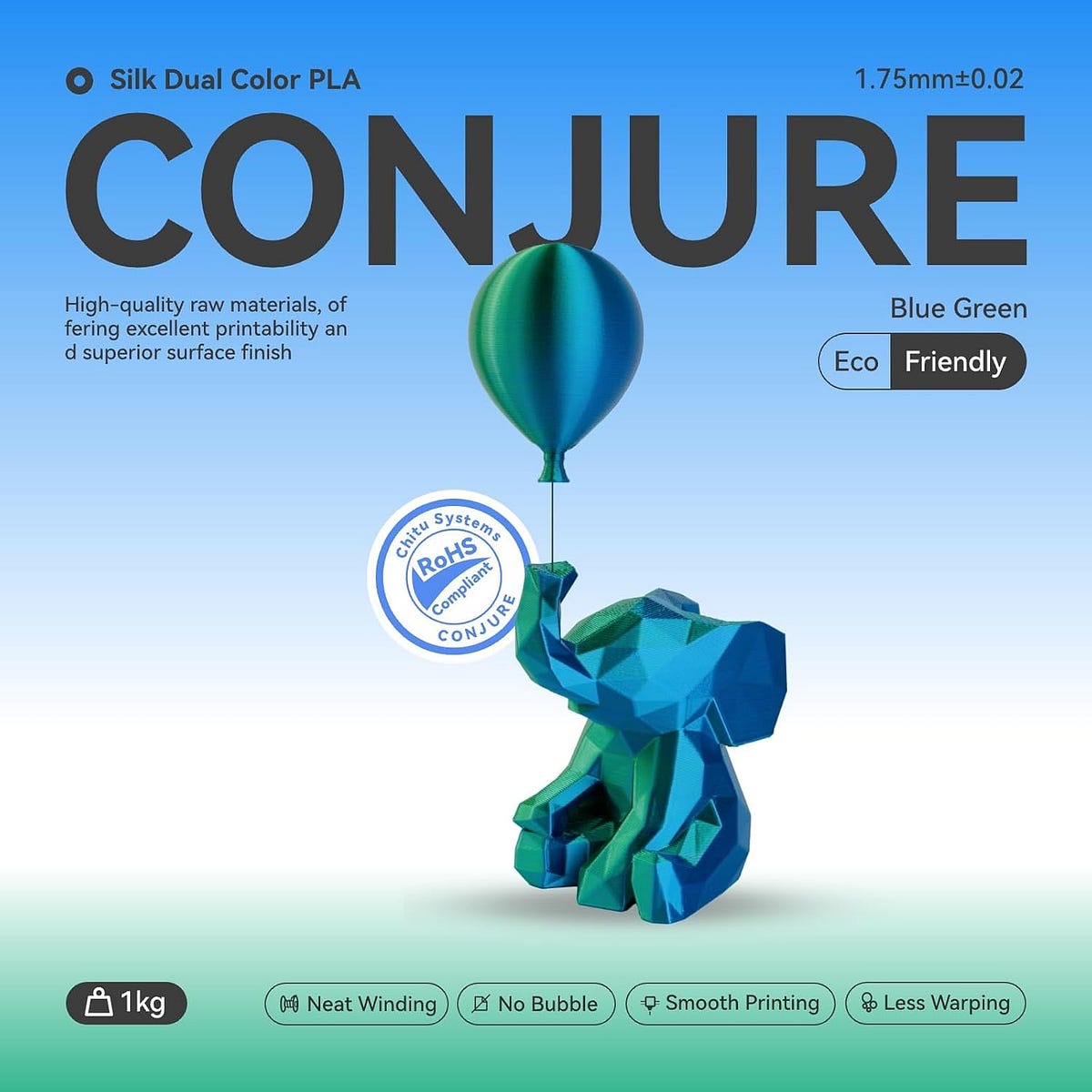 - Dual Color Effect: The standout feature of the Chitu Systems Conjure Silk PLA filament is its dual color design that shifts beautifully between blue and green hues. This dual-tone effect adds dynamic depth and a shimmering silk-like finish to prints, making every object truly unique without the need for post-processing or painting.