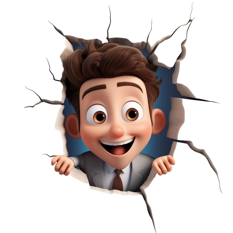 donned in a sharp suit, gleefully peeking through a broken wall. His infectious smile radiates