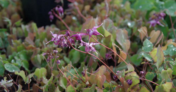 Epimedium grandiflorum ‘Lilafee’, een elfenbloem, is een mooie rozebloeiende bodembedekkende plant. De bloemetjes van Epimedium grandiflorum ‘Lilafee’ lijken wel wat op de gespoorde bloemen van de Akelei.