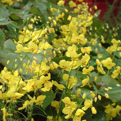 A selection from the original hybrid, having large flowers and particularly bright foliage. It forms beautiful spreading evergreen ground cover even in quite dry conditions. The leaves open an attractive pale green; contrasting well with the last years foliage and having lovely red netting. The flowers are like upright spikes of glowing sunshine yellow daffodils. to see them at their best may need you to trim away last years foliage in early spring. ‘Wisley’ colours a little less in the leaf than its similar cousin ‘Frohnleiten’. 45cm. Easily grown in any good soil. ( E.perraldianum x E. pinnatum subsp. colchicum ).