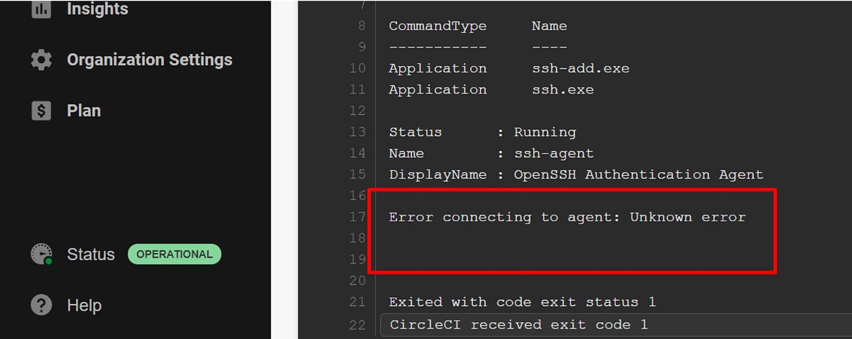 While implementing above use case I’m getting ‘Error Connecting To Agent: Unknown Error’ like below. I started ssh-agent in CircleCI windows VM. It’s seems running even though I got below issue.