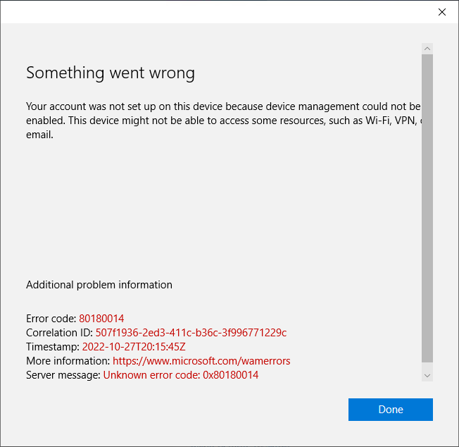 I was attempting to manually join a Windows 10 computer to Microsoft 365 / Azure AD / Intune and I ran into the following error.