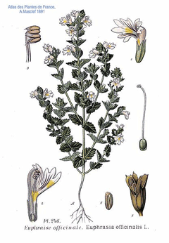 Eyebright has a long history of herbal use in the treatment of eye problems and is still in current herbal use[4]. It is important that only the correct forms of eyebright, with glandular hairs on the calyx, are used, since other forms do not possess medicinal virtues[268]. Eyebright tightens the mucous membranes of the eye and appears to relieve the inflammation of conjunctivitis and blepharitis[254]. Its ability to counter catarrh means that it is often used for infectious and allergic conditions affecting the eyes, middle ear, sinuses and nasal passages[254]. The whole plant is anti-inflammatory, astringent, digestive, ophthalmic and slightly tonic[[4, 7, 9, 14, 165, 220]. It is taken internally in the treatment of catarrh, sinusitis, hay fever, upper respiratory tract infections etc[238]. As an ophthalmic, an infusion of the plant can be taken internally or used as an eye wash. Alternatively, the diluted juice can be dropped into the eyes[232]. Some caution should be exercised, experimentally it can induce side effects including dim vision[222]. The plant’s astringency makes it inappropriate for treating dry or stuffy congestion[254]. The plant can be used externally as a poultice to aid the healing of wounds[268]. Eyebright should be harvested when in flower and can be dried for later use[238]. The dried herb is a ingredient of herbal smoking mixtures, used in the treatment of chronic bronchial colds[4]. A homeopathic remedy is made from the expressed juice of the plant[232]. It is used particularly in the treatment of eye inflammations and colds[7, 232].