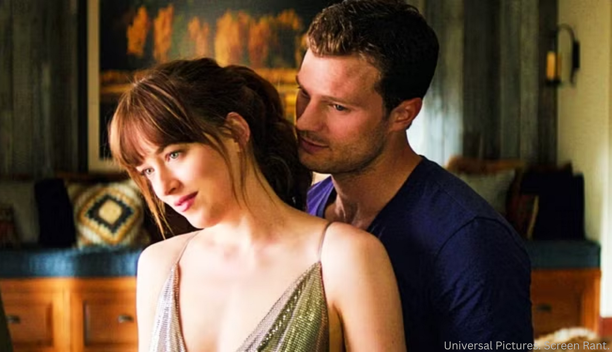 It cuts to Anastasia and Christian in a penthouse. Anastasia walked in wearing a white nightgown for sleeping. Christian wore a tight black t-shirt while brooding over a grand piano.