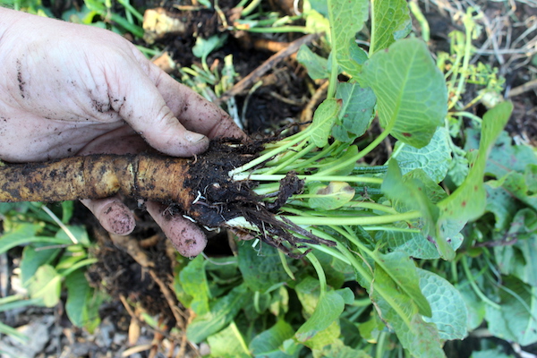 Slightly later in the season the leaves dry out and tear when pulled, and they’re no longer good eating.