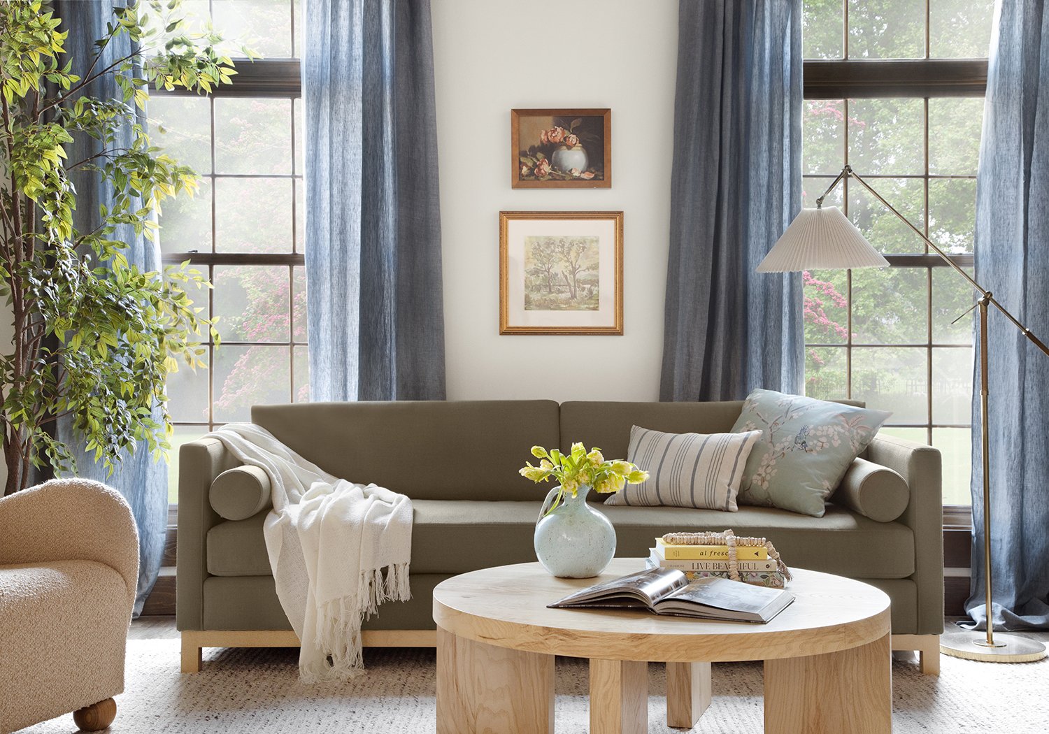 If you’re merely dipping your toe into the green living room look, consider olive throw pillows and blankets, faux and fresh greenery, and green accent seating. Otherwise, go all-in with a green statement sofa or a little green on the walls (paint color ideas here).