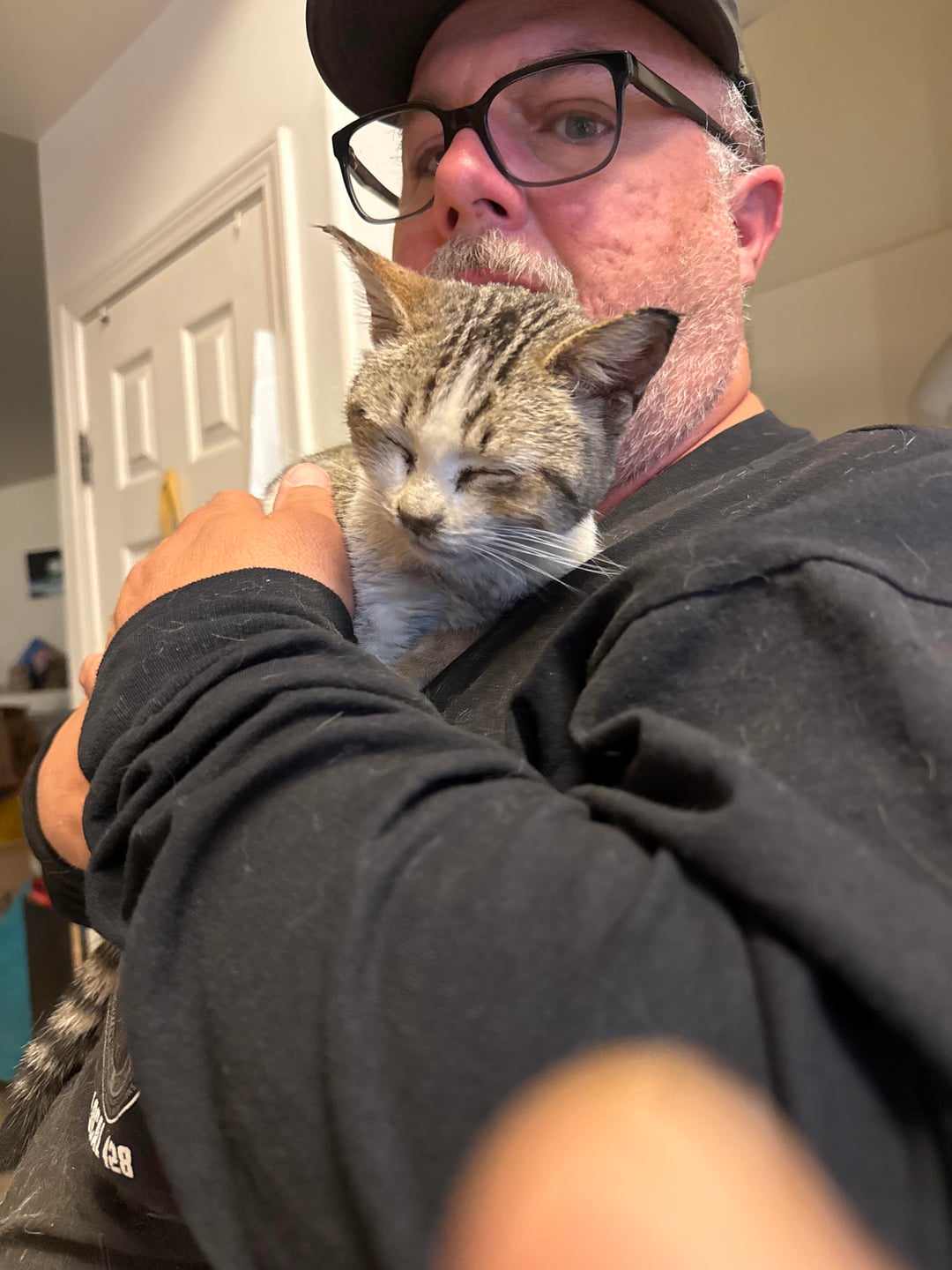 The day my hubby found her was also the anniversary of my daughter’s feral TNR soul kitty, Carlos, passing. Hubby never goes to that gas station and can’t explain why he did that night. We believe Carlos led him to this desperate kitten and she is now in her forever home. We initially were calling her Carli, in honor of Carlos, but her wobbles have earned her the nickname of Tippy 😂. She’s getting stronger by the day and is so sweet and affectionate. The moment hubby put her in his lap and cranked the heater, she began purring and making biscuits. She snuggles into our laps or necks and rubs her face on ours. I don’t know how she ended up at that gas station but we are absolutely thrilled to add her to our family 💜