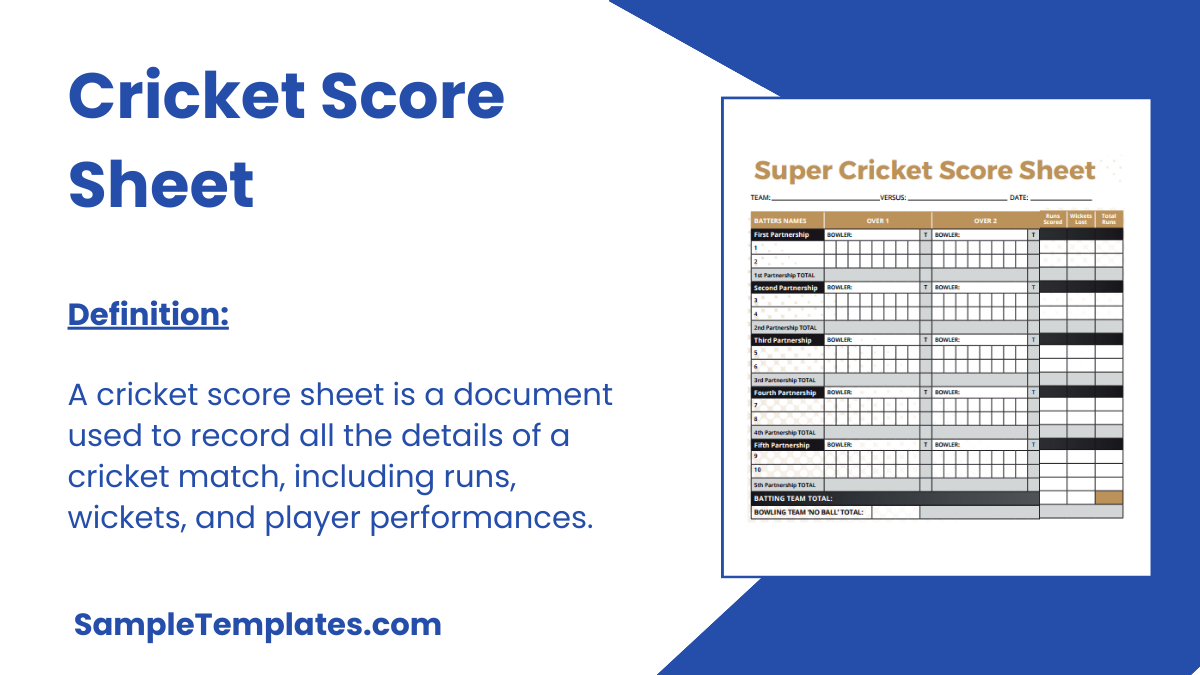 A cricket score sheet is a document used to record and track the details of a cricket match, including runs scored by each player, wickets taken, and other relevant statistics.