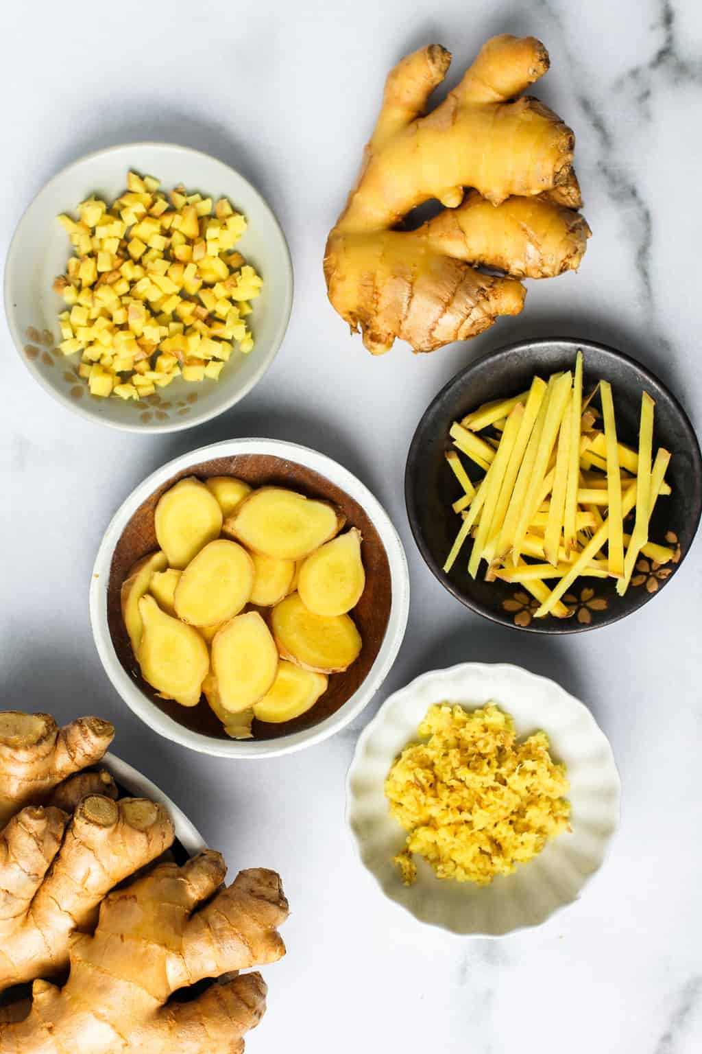 whole ginger root, slices, diced, silvers and paste in bowls