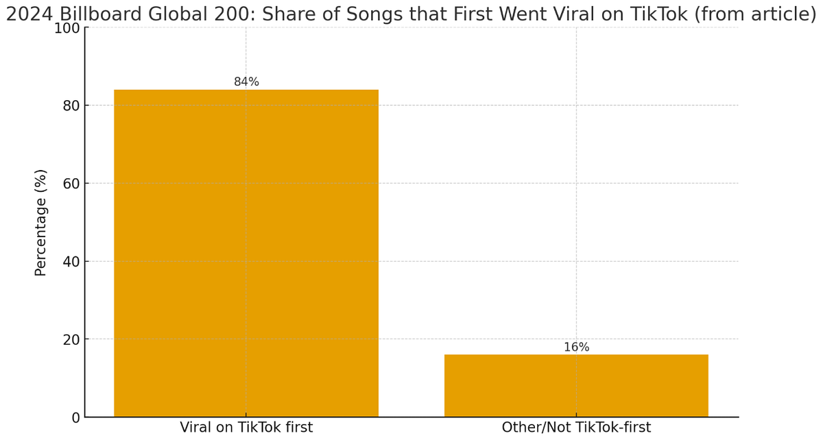 Music Business Worldwide. (2025, February 13). TikTok: 84% of songs that entered Billboard’s Global 200 chart in 2024 went viral on our platform first. Music Business Worldwide. https://www.musicbusinessworldwide.com/tiktok-84-of-songs-that-entered-billboards-global-200-chart-in-2024-went-viral-on-our-platform-first/