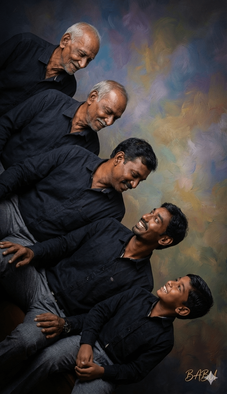 Create a studio-art-style photograph of a young boy from attached image as the prototype—100% AI-generated—producing five generations arranged diagonally from top to bottom: the eldest (senior) at the top down to the youngest (little brother) at the bottom. Each person’s face turns inward toward the others, captured in an astonishing low-light setting. The background is colorful abstract, with exquisitely fine textures and soft, gentle color tones. Show a seamless