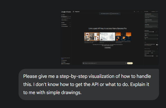 I didn't know how to use Nano Banana Pro in Ai studio using the API. I asked for a step-by-step visual explanation with simple drawings.