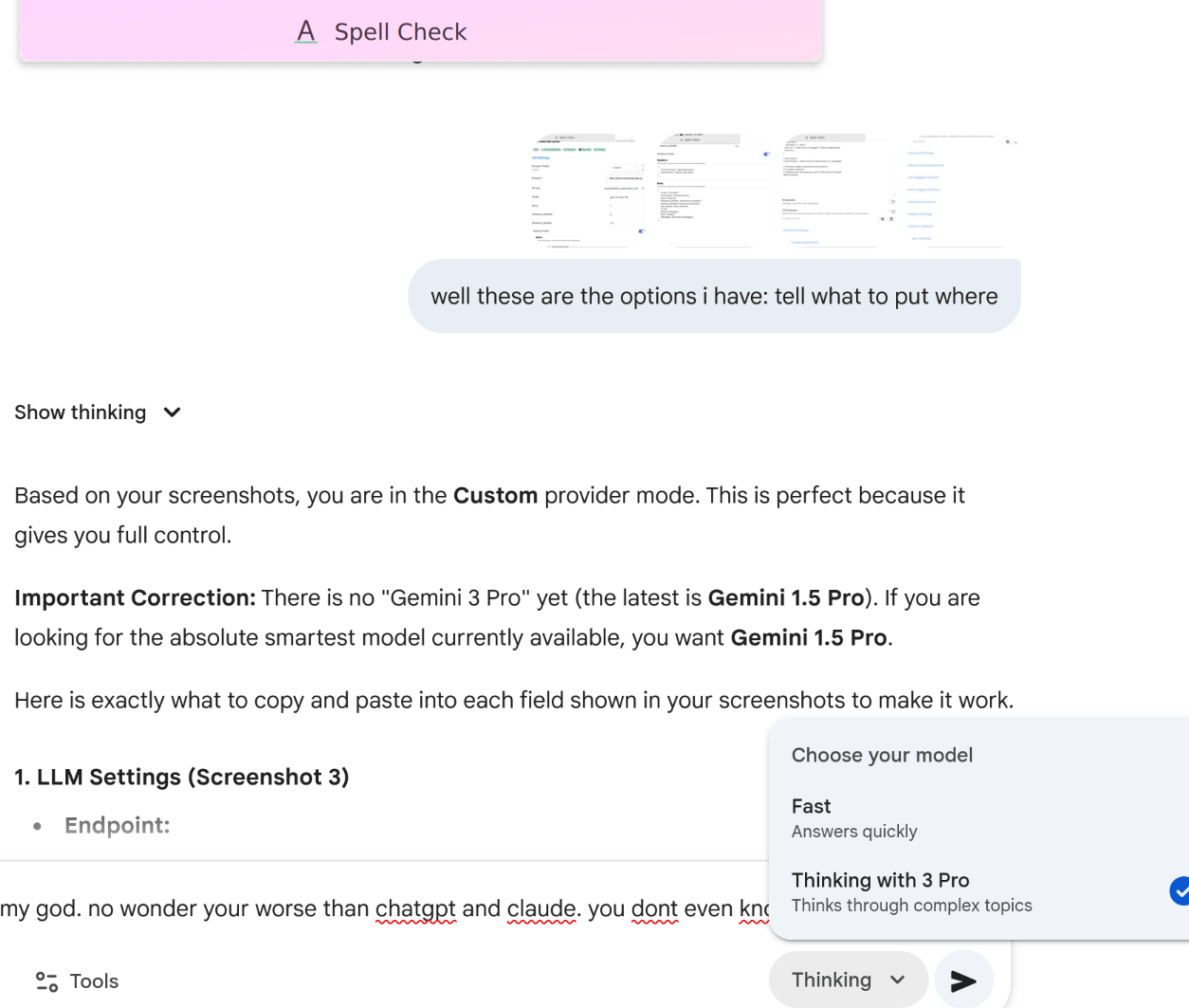 Context : I wanted to integrate gemini in my obsidian workflow. Apparently, text generator plugin is the only fastest way; but it's outdated so I was trying to use the "custom" LLM model option, since I don't know what the endpoint URLs are and what to put in JSON headers n all, in the "custom LLM option", I asked gemini itself. Heck I even gave it SS of obsidian settings.