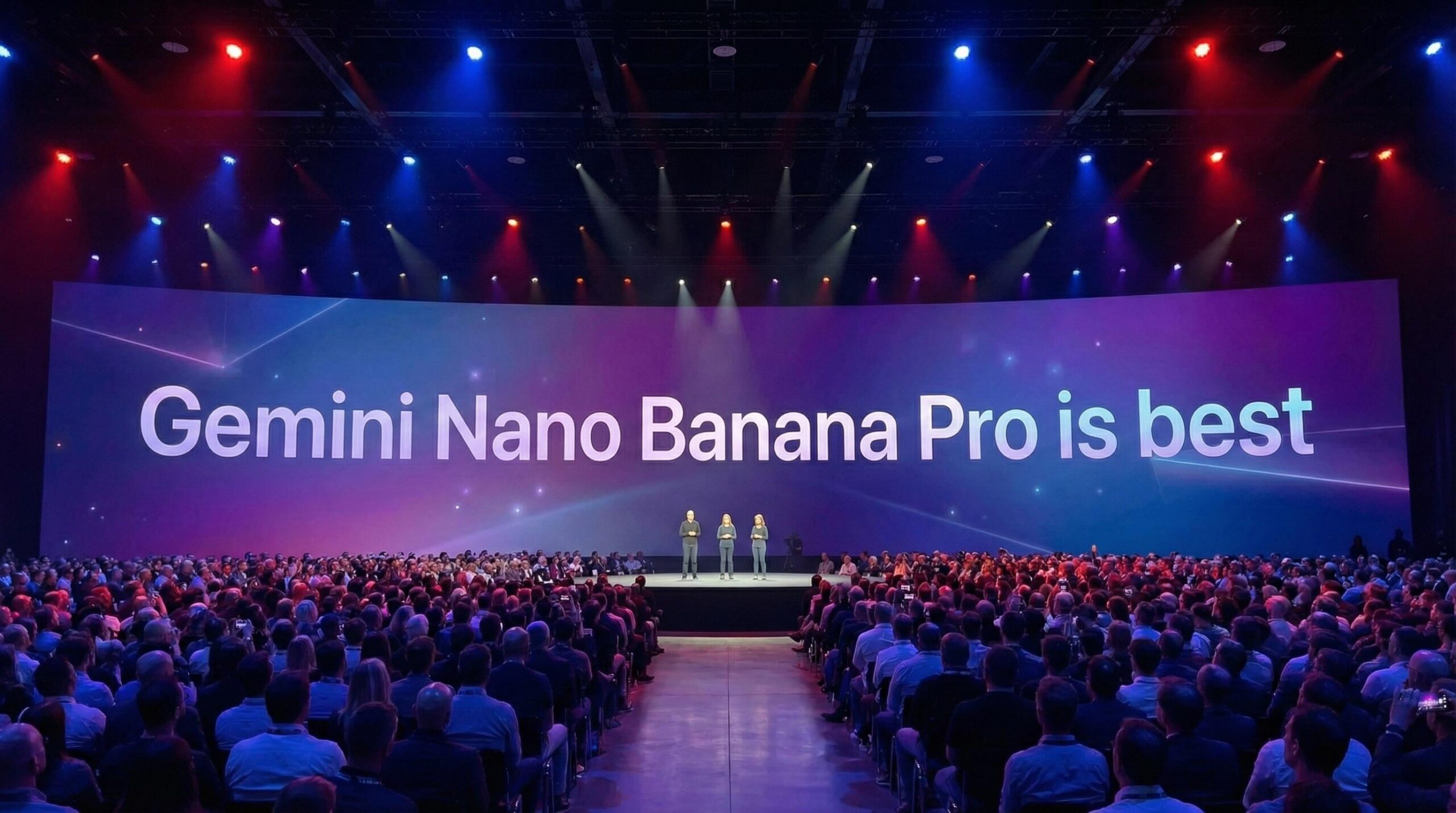 A grand Apple keynote event with a large audience. The scene is dark, illuminated by vibrant, colorful stage lights. The camera focuses on a very wide, curved main screen. Both the text and the screen have a sense of perspective. Small human silhouettes stand on the stage. The background features a purple-to-blue diffuse gradient. The white text has a slight gradient as well. The overall look should feel like a real on-site shot, with a premium, high-end atmosphere. 16:9 aspect ratio, 4K resolution.