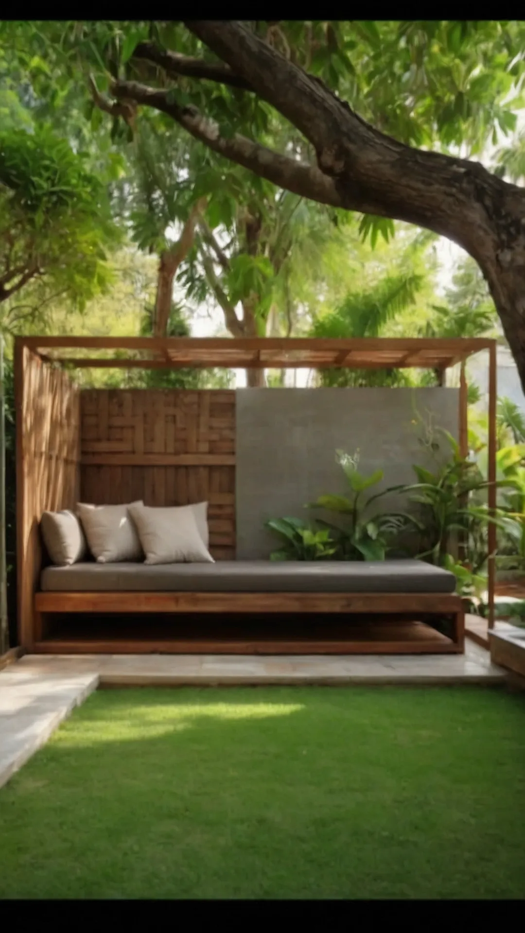 This garden is totally nailing the whole “less is more” vibe. Instead of a crazy jungle of plants, it’s got a chill spot with a cool wooden roof that’s basically begging for you to come hang out. They’ve got just enough greenery around it to make it feel like a secret hideaway, perfect for escaping homework or just pretending you’re a fancy celebrity on vacation.