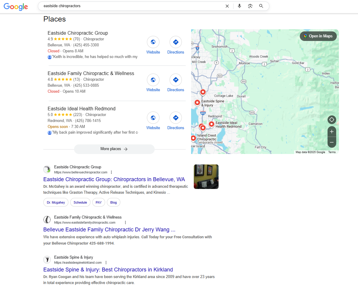Searching “Eastside Chiropractors” on Google delivers a structured, multi-faceted results page designed to connect you with healthcare providers in your area quickly. Google’s primary goal is to present a directory of potential chiropractors, making it easy for you to evaluate and contact them.