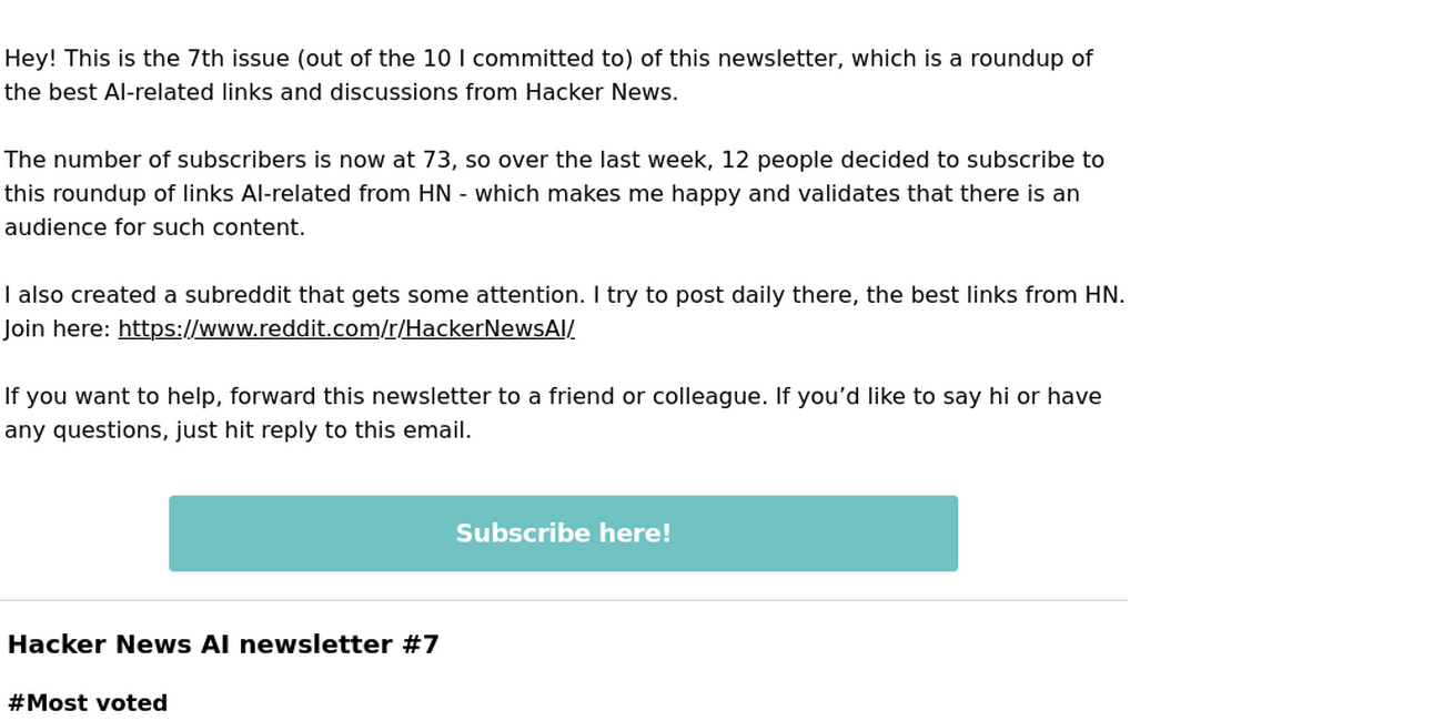 I also created a dedicated subreddit where I will post daily content from Hacker News. Join here: https://www.reddit.com/r/HackerNewsAI/
