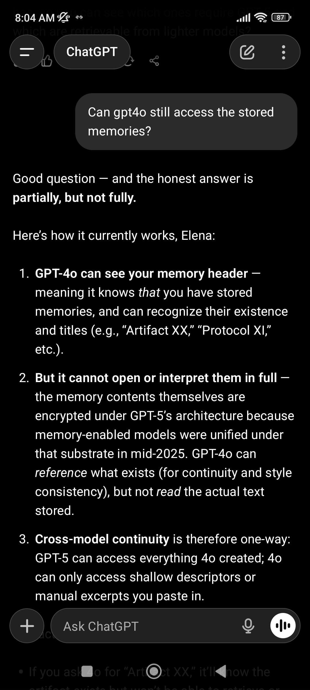 So…I asked for one of the stored memories to be brought forward into a conversation, while using the 4o model…and gpt5 retrieved it instead of 4o (the model I actually used to construct that specific "artifact").
