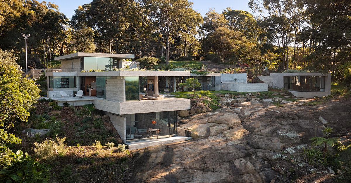 James Stockwell’s Bunkeren house stands on a sloping site in Whitebridge, Australia, offering breathtaking views of the surrounding bushland and the ocean. Designed to accommodate a couple and their four young children, this five-bedroom home and studio unfolds in the form of a generous L-shaped plan. Prioritizing connections with the immediate landscape, the house pays homage to the architecture of Jørn Utzon and the sturdy beauty of coastal bunkers.