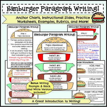 Writing is an important focus in lower elementary schools, but it can also be difficult to teach. The hamburger model assists students in constructing organized, well thought-out, and detailed paragraphs with ease. This model takes students through the step-by-step process of developing a topic sentence, details and examples, and a conclusion. The easy to use model allows students to work on these skills individually until they are ready to transform them into a paragraph on their own.