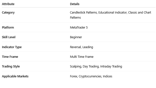 It detects Hammer and Inverted Hammer candlestick patterns on MT5 charts.