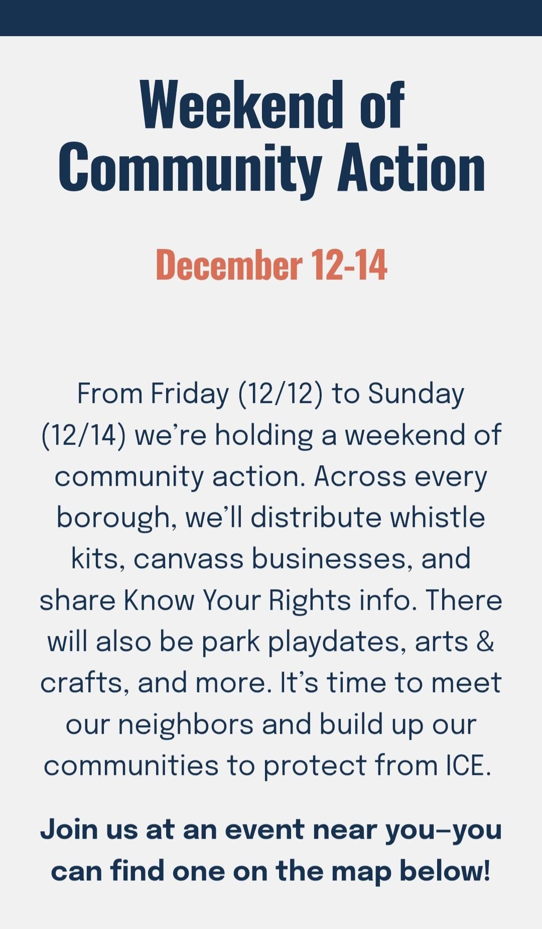 Across every borough, we’ll distribute whistle kits, canvass businesses, and share Know Your Rights info.