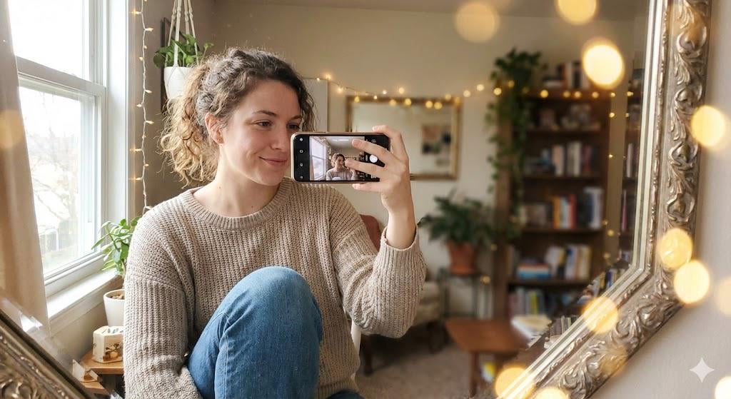 Create an Instagram-style self-portrait of a 25-year-old woman, holding her phone in front of a mirror taking a selfie, soft natural lighting, casual modern outfit, warm and vibrant tones, shallow depth of field, realistic facial features, high detail, cozy home background, slightly blurred background for bokeh effect, authentic and candid expression, digital photography style.