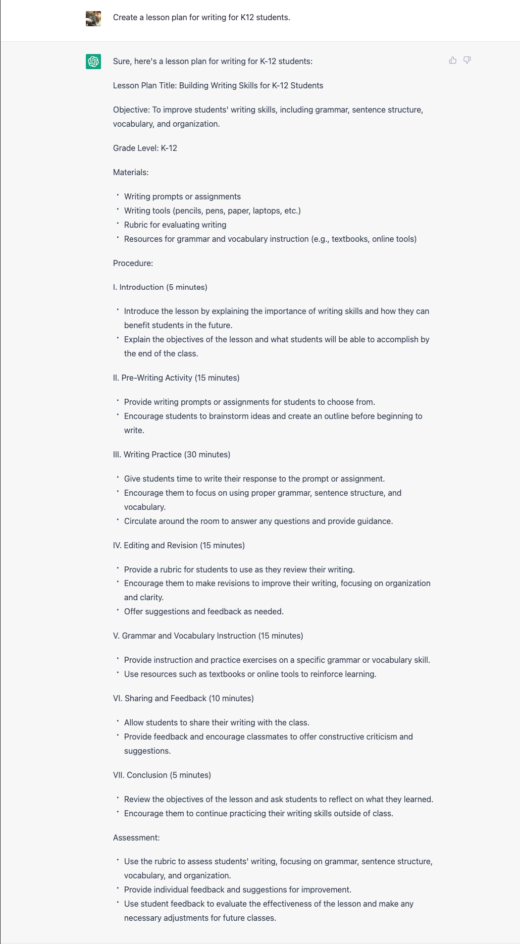 For instance, log in to your ChatGPT account and ask ChatGPT to create a lesson plan for writing for K12 students. You will get the following result: