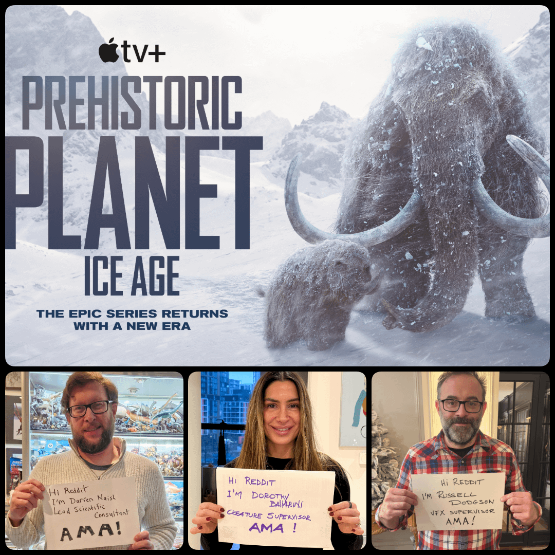 We are the team responsible for bringing the megafauna of Apple TV’s Prehistoric Planet: Ice Age to life. We're Russell Dodgson (Production VFX Supervisor), Dorothy Ballarini (Framestore Creature Supervisor) and Darren Naish (Lead Scientific Consultant). We're here to answer your questions.