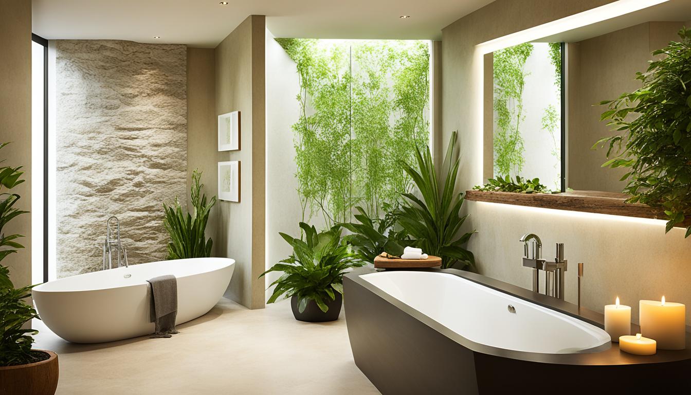 Using natural materials like wood and stone makes the room more serene. Add wood details and stone counters for a warm vibe. Don’t forget to place plants, such as Aloe Vera, to bring nature inside.