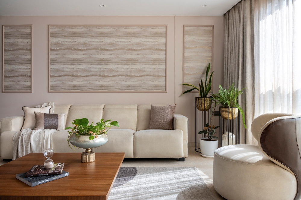 A plush beige sofa, accent chairs, and a sculptural wooden coffee table create a refined setting, while large windows allow natural light to flood the space. Thoughtfully placed greenery and décor elements add vibrancy which complementing the understated textures on the walls. A sleek media unit with a wooden-accented base anchors the space, blending functionality with aesthetic appeal. Layered lighting and curated artwork complete the look, offering a sophisticated yet comfortable retreat.