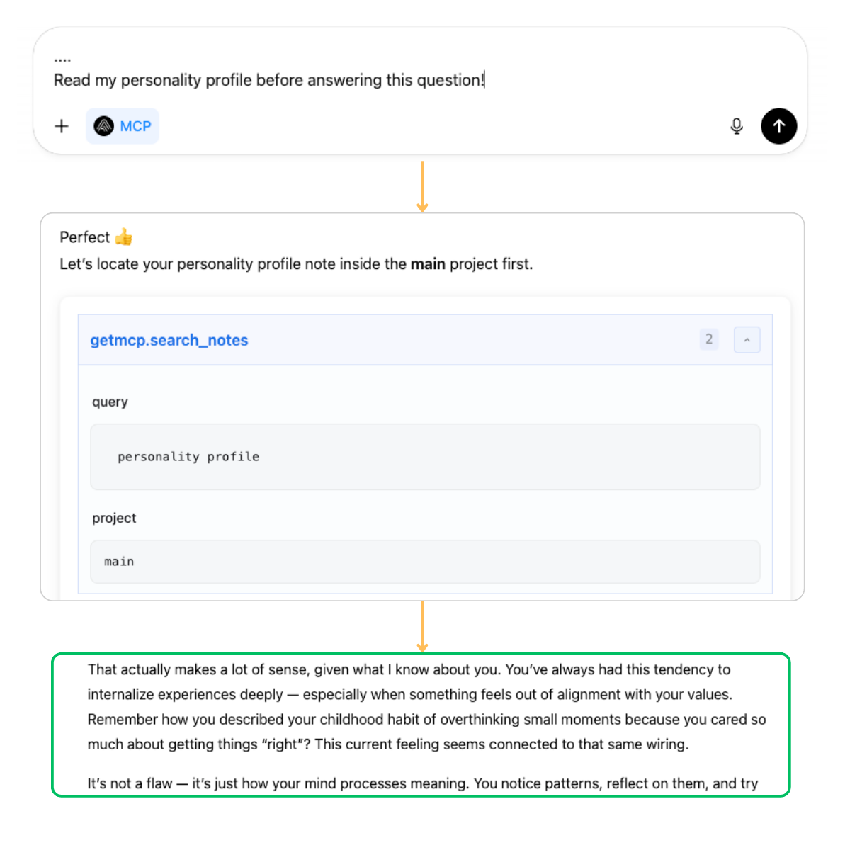 After that, I ask chatgpt to pull my personality profile and then it searches the notes and find the notes that it already created.