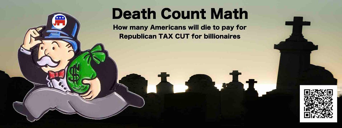 Republicans want to slash $880 billion from Medicaid in their budget. What does this mean? How many people rely on Medicaid for health insurance? How many of them are seniors or disabled? How many of them are likely to die when their Medicaid is cut? How many deaths per billionaire could there be? Where are most of the deaths likely to be? Check this infographic. Click on any item for details.