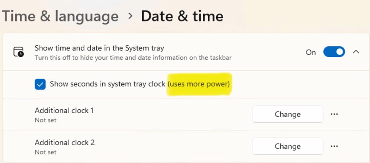 I refuse to believe showing seconds in systray makes even one second shorter of a full to empty battery use, on modern computers that meet the minimum CPU requirements for Windows 11!
