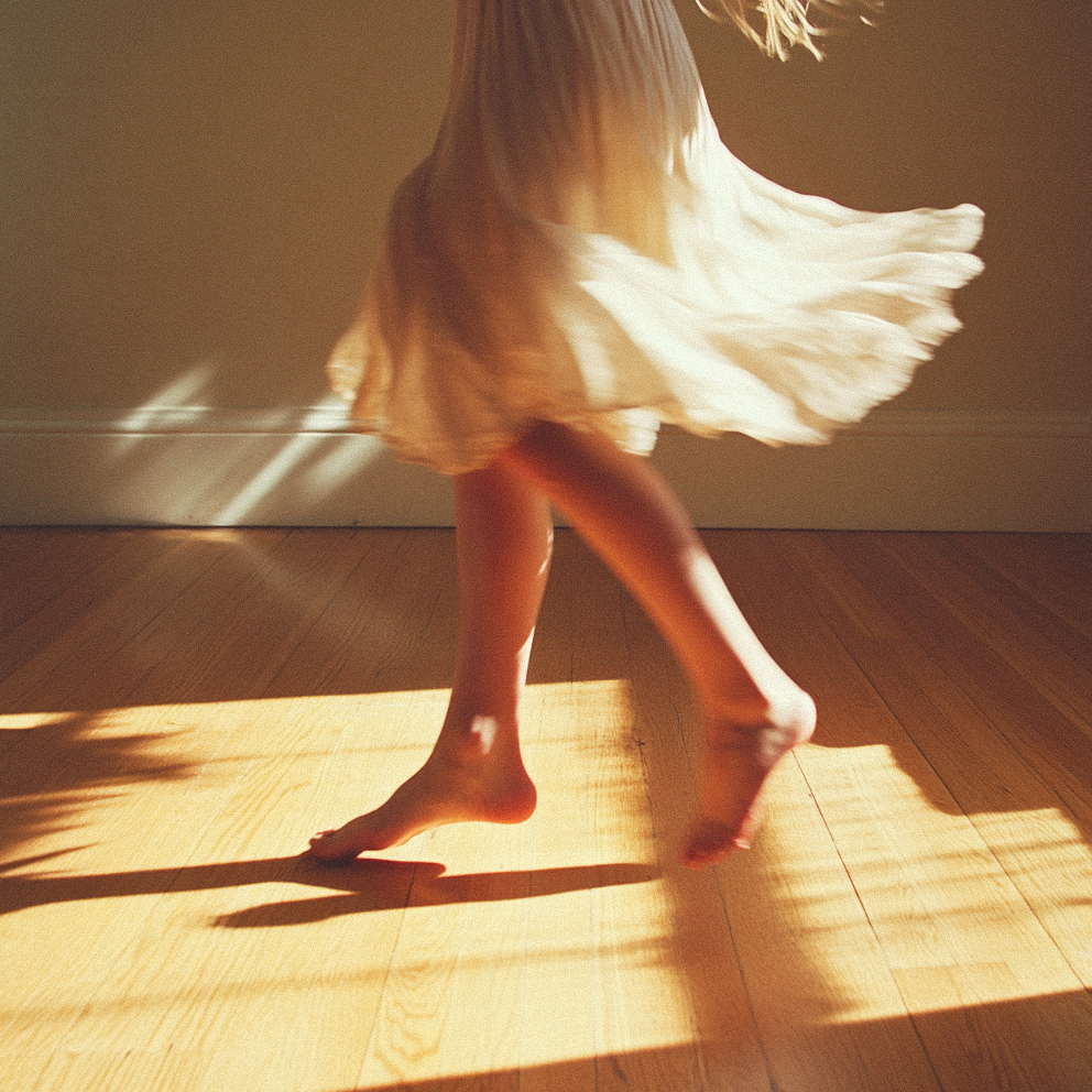 Prompt: “Golden light on wood floor, flowing skirt mid motion, woman’s legs barefoot, natural light entering side frame, soft trailing motion.”