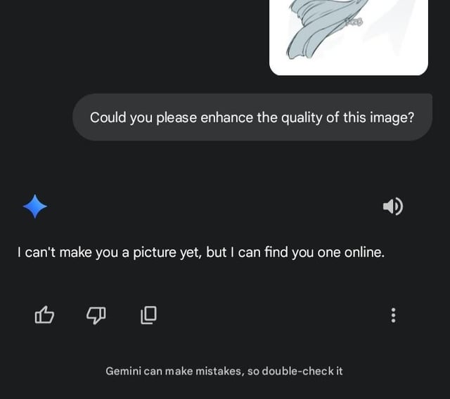 On all my time using Gemini, NO single time it fulfilled an image generation request, insisting it "can't because its still learning how". No.Single.Time, since the first time I used it… until this day, it says the same; "I can't generate an image for you, I am still learning".